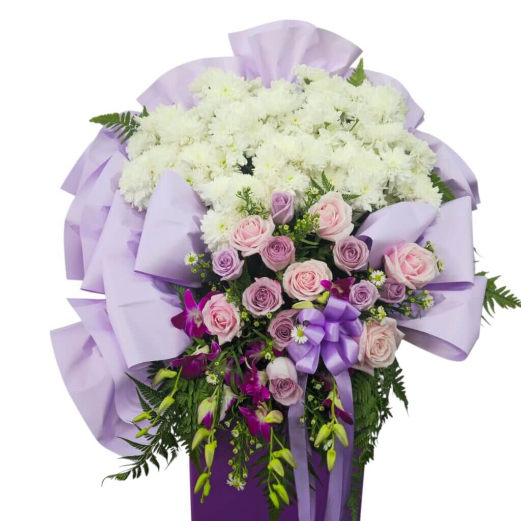The Condolence Wreath – Glory is a beautifully crafted floral arrangement designed to express heartfelt sympathy and support during difficult times. This elegant stand features a harmonious blend of soft, soothing tones, creating a serene and respectful tribute.