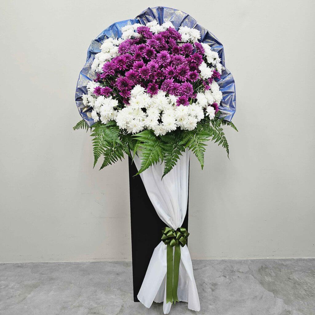 The Heavenly-Being Condolence Bouquet is a thoughtfully crafted flower arrangement stand designed to offer comfort and solace during difficult times. This elegant display features delicate pom poms, which symbolise love and remembrance, beautifully complemented by lush leaves that evoke a sense of peace. Each bouquet is thoughtfully wrapped in sophisticated decorated paper, adding an element of grace and serenity.