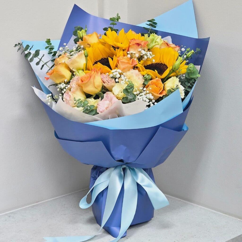 Graceful Beauty is an enchanting bouquet that showcases the vibrant charm of three stunning sunflowers, beautifully complemented by the rich hues of orange roses. Delicate champagne eustomas add a touch of elegance, while sprigs of baby’s breath provide a soft, airy contrast. Eucalyptus leaves lend a refreshing scent and texture, tying the arrangement together with a natural grace.