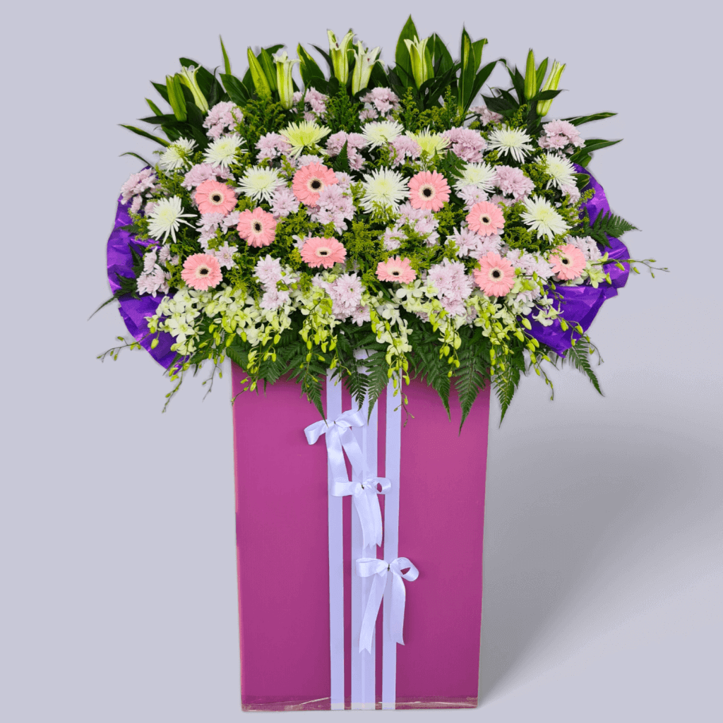 Service and Sacrifice Wreath Stand is a stunning and elegant way to honor the memory of your loved ones. This product is thoughtfully crafted with the finest flowers, including 10 Lilies, 12 Chrysanthemums, Gerberas, and orchids, and 1 pom pom and phoenix. This can leave a lasting impression on anyone who sees them.